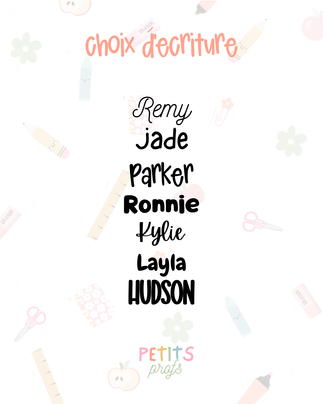 Veuillez inscrire le prénom, choix d'écriture et l'icon à graver dans la boîte de texte lors du passage à la caisse.